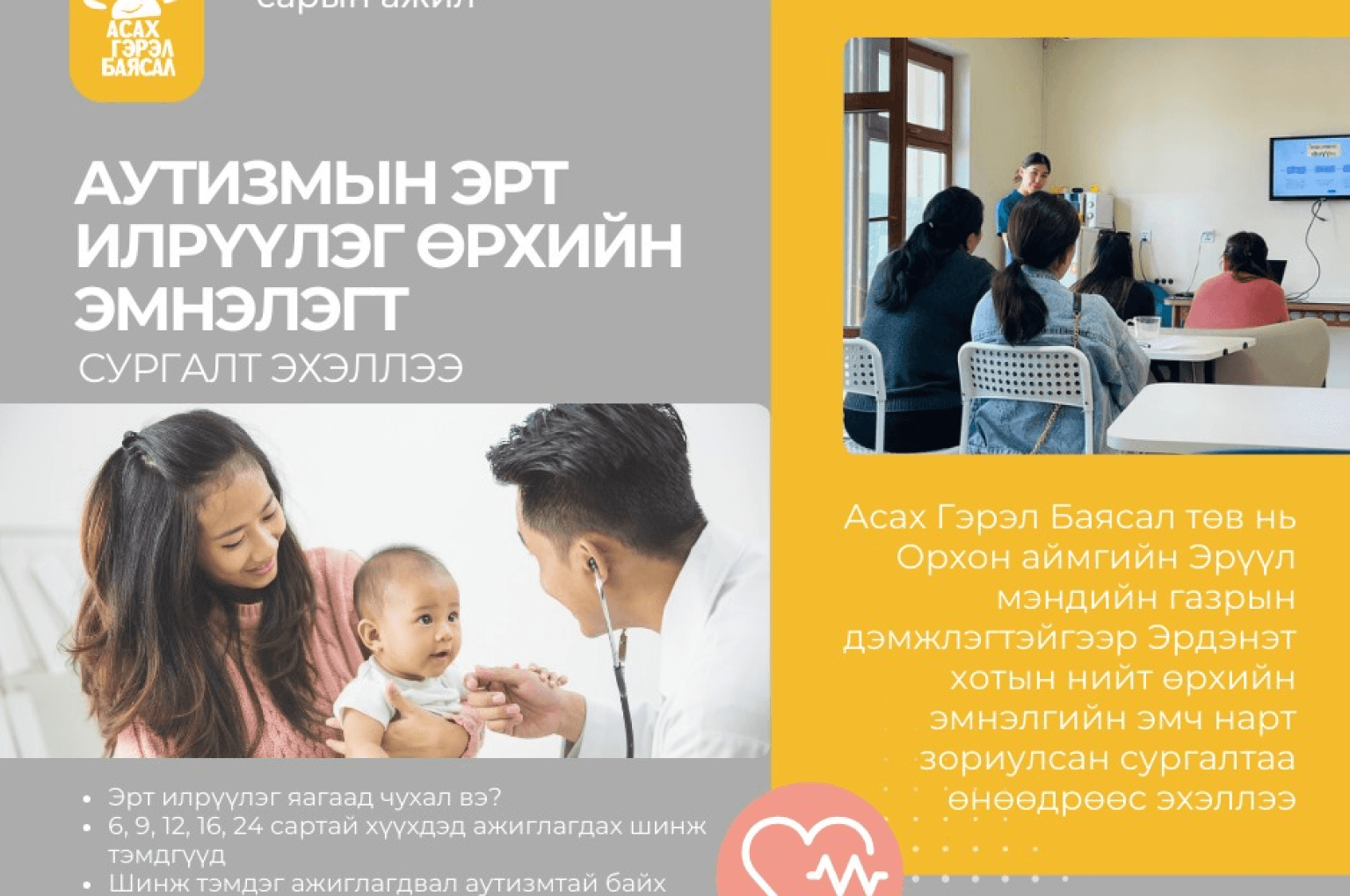 Асах Гэрэл Баясал төв нь Орхон аймгийн Эрүүл мэндийн газрын дэмжлэгтэйгээр Эрдэнэт хотын нийт өрхийн эмнэлгийн эмч нарт зориулсан "Аутизмын эрт илрүүлэг өрхийн эмнэлэгт" сургалтаа өнөөдрөөс эхэллээ.